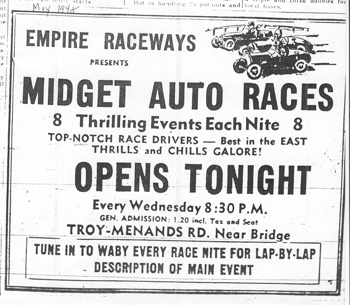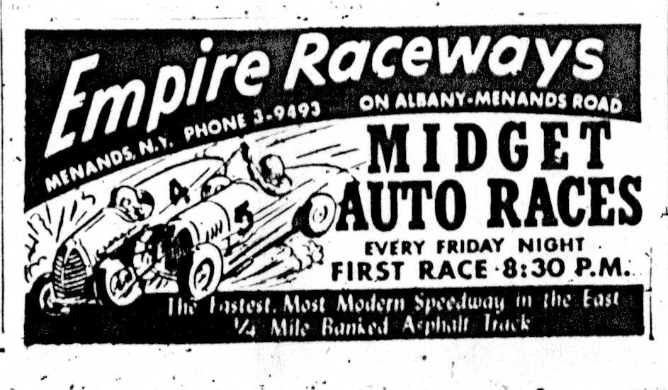 & /components/TrackPage.mhtml, version=>'2', new=>'2006-02-04', updated=>'2018-04-24', license=>'CC-NC-SA', author=>'Richard Welty', owner=>'NA Websites', date=>'2006-2018', oval=>'paved,defunct', road=>'', drag=>'', kart=>'', offroad=>'', adBeforeTOC => '', trackName => 'Empire Raceways', trackStreetAddr => '431 Broadway', trackCityState => 'Menands, NY', trackZip => '12204', trackCountry=>'ca', introduction => ' was a 1/4 mile paved oval located in Menands, New York.